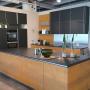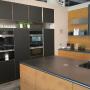Die Holzfronten sind mit durchlaufendem Furnier, den Kontrast liefern die Schränke in schwarzem Mattglas. Hochwertige Miele Geräte und das Bora Classic 2.0 mit vollflächen Induktion und Teppanyaki machen Kochen zum Kinderspiel.