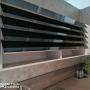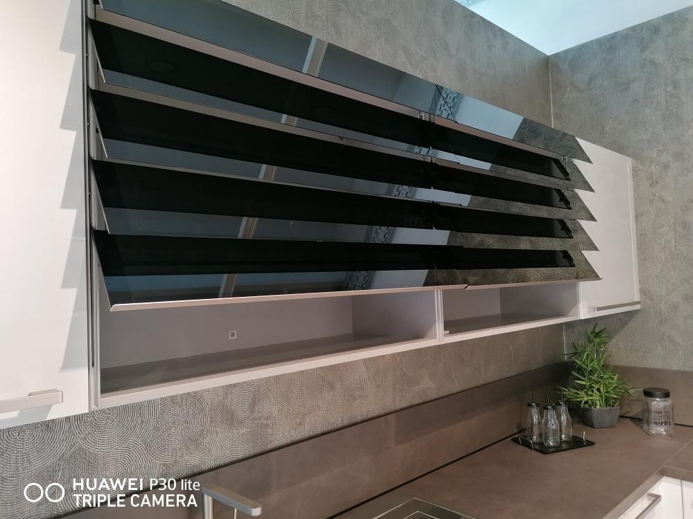 Zwei Hängeschränke mit Glaslamellen passen wunderbar zur Küche.
